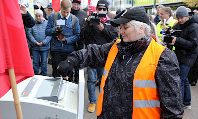 Rund 100 Mitarbeitende des öffentlichen Verkehrs protestierten am 18. November 2025 in Zürich-Oerlikon für bessere Arbeitsbedingungen und für mehr Respekt. Vor dem Hauptsitz des Zürcher Verkehrsverbundes (ZVV) beim Bahnhof Oerlikon schredderten die Mitarbeitenden symbolisch den Rahmen-Gesamtarbeitsvertrag (GAV).