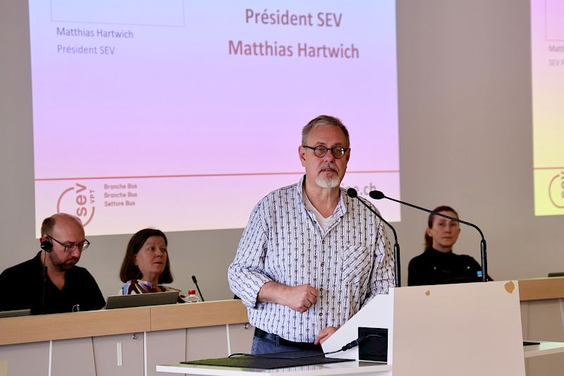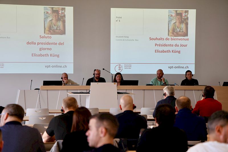 VPT-Zentralpräsident Gilbert D’Alessandro freute sich, die 60 Kolleginnen und Kollegen sowie Gäste aus Sektionen und Busunternehmungen aus der ganzen Schweiz begrüssen zu dürfen. Er erinnerte an die DNA von Branchentagungen: Momente des Austauschs, der Solidarität und der Anliegen unter Kolleginnen und Kollegen zu schaffen. Für ihn ist nach jahrelanger Beobachtung und Feststellung der gesundheitsbelastenden Arbeitsbedingungen der Zeitpunkt gekommen, zu stärkeren Mitteln zu greifen, um sich Gehör zu verschaffen. «Die Gesundheit am Arbeitsplatz ist heilig. Sie muss respektiert werden! Wenn wir Kolleg:innen haben, die schon mit 47 Jahren vom Beruf gezeichnet sind und nicht wissen, wie sie bis 65 durchhalten sollen, müssen wir gemeinsam eine Antwort finden! Die Gesundheit und Sicherheit unserer Kolleginnen und Kollegen ist kein Luxus, sondern eine Grundvoraussetzung für den öffentlichen Verkehr (öV). Das hat natürlich seinen Preis. Wir müssen handeln, bevor es zu Tragödien kommt.»