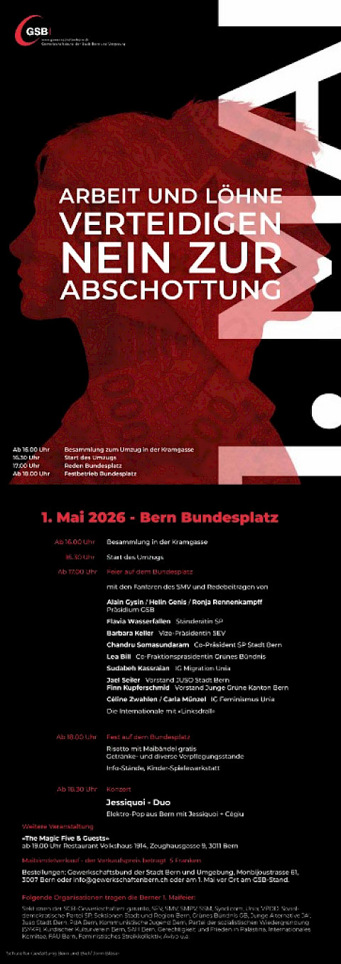 Seit 1890 ist der 1. Mai der internationale Tag der Arbeit und somit der wichtigste Feiertag der Gewerkschaftsbewegung. Der SEV wird in vielen Orten unterwegs sein, an Kundgebungen teilnehmen und mit Redner:innen präsent sein.