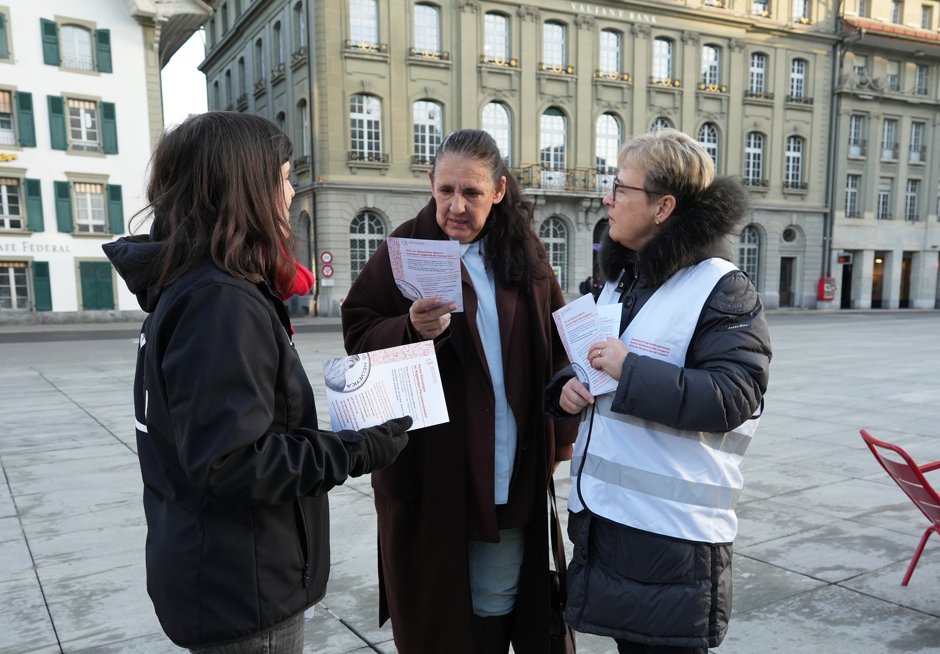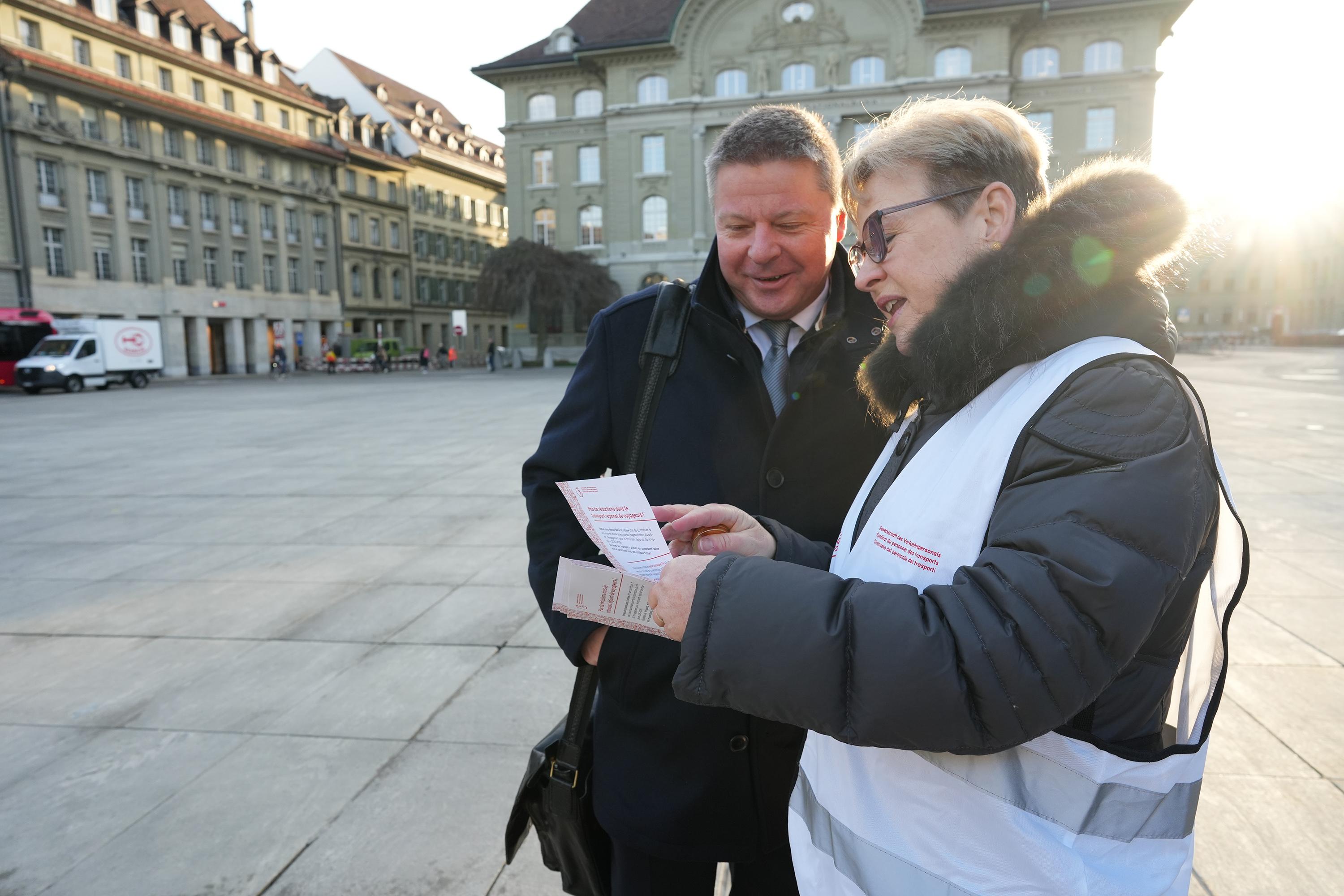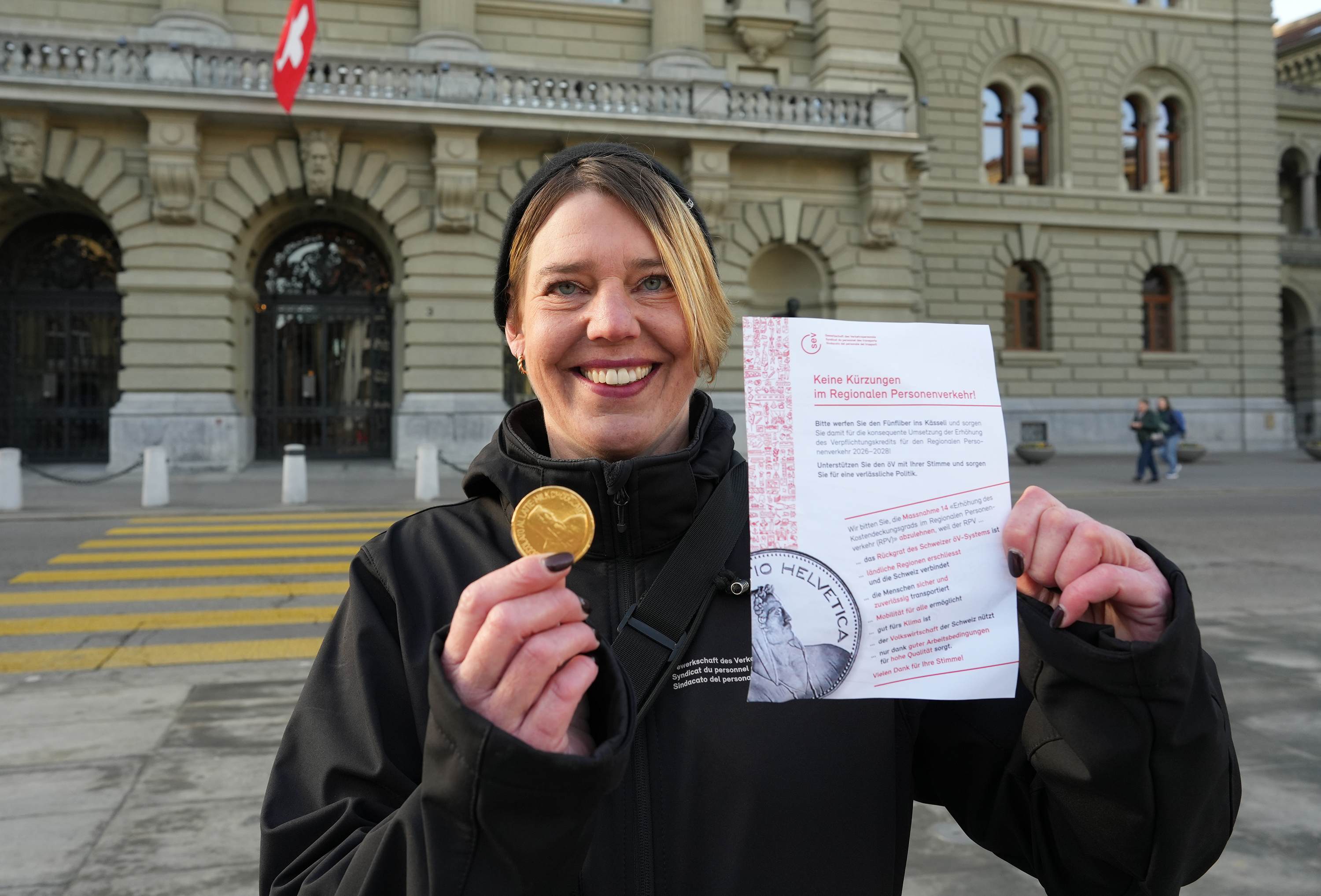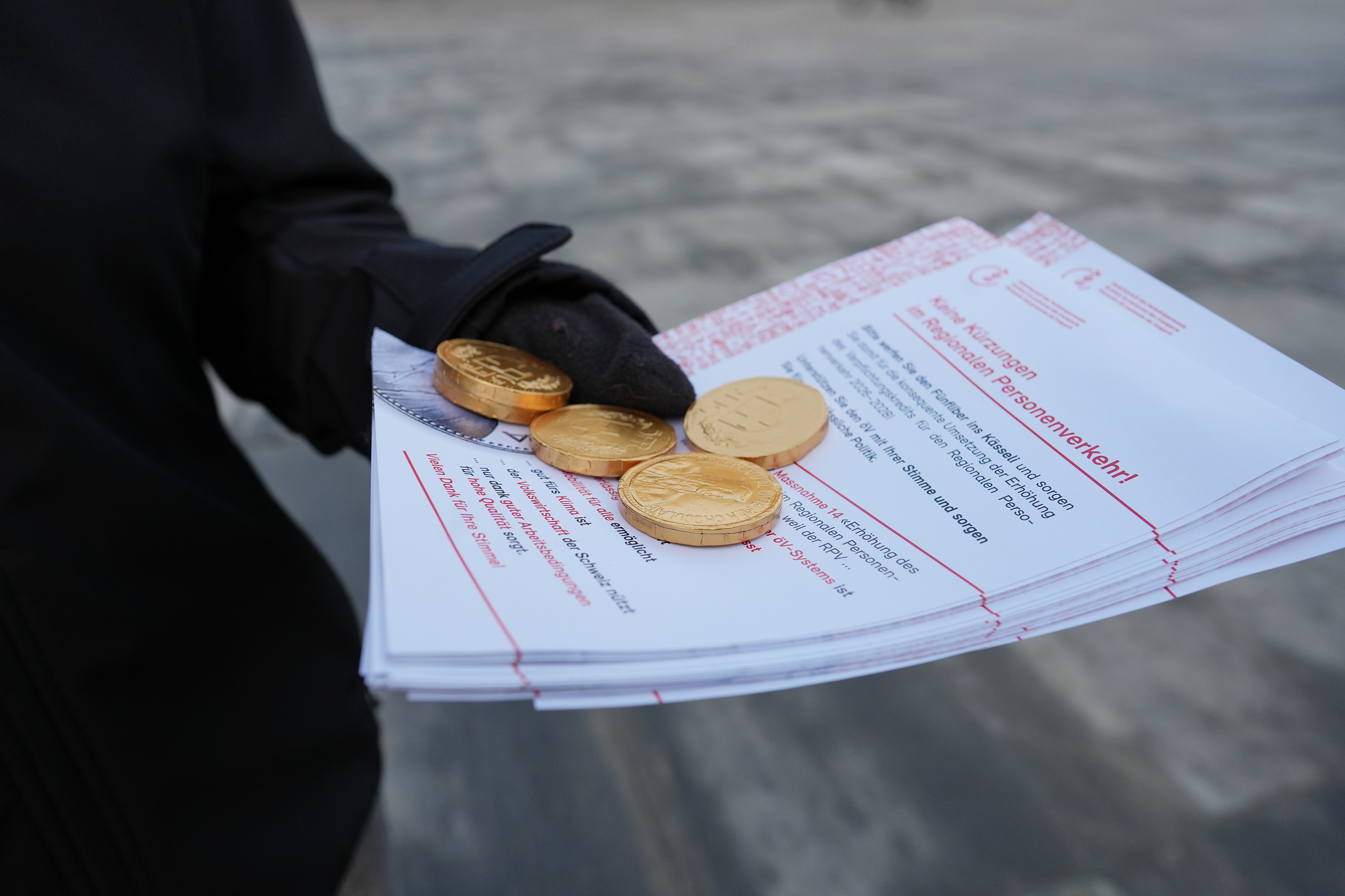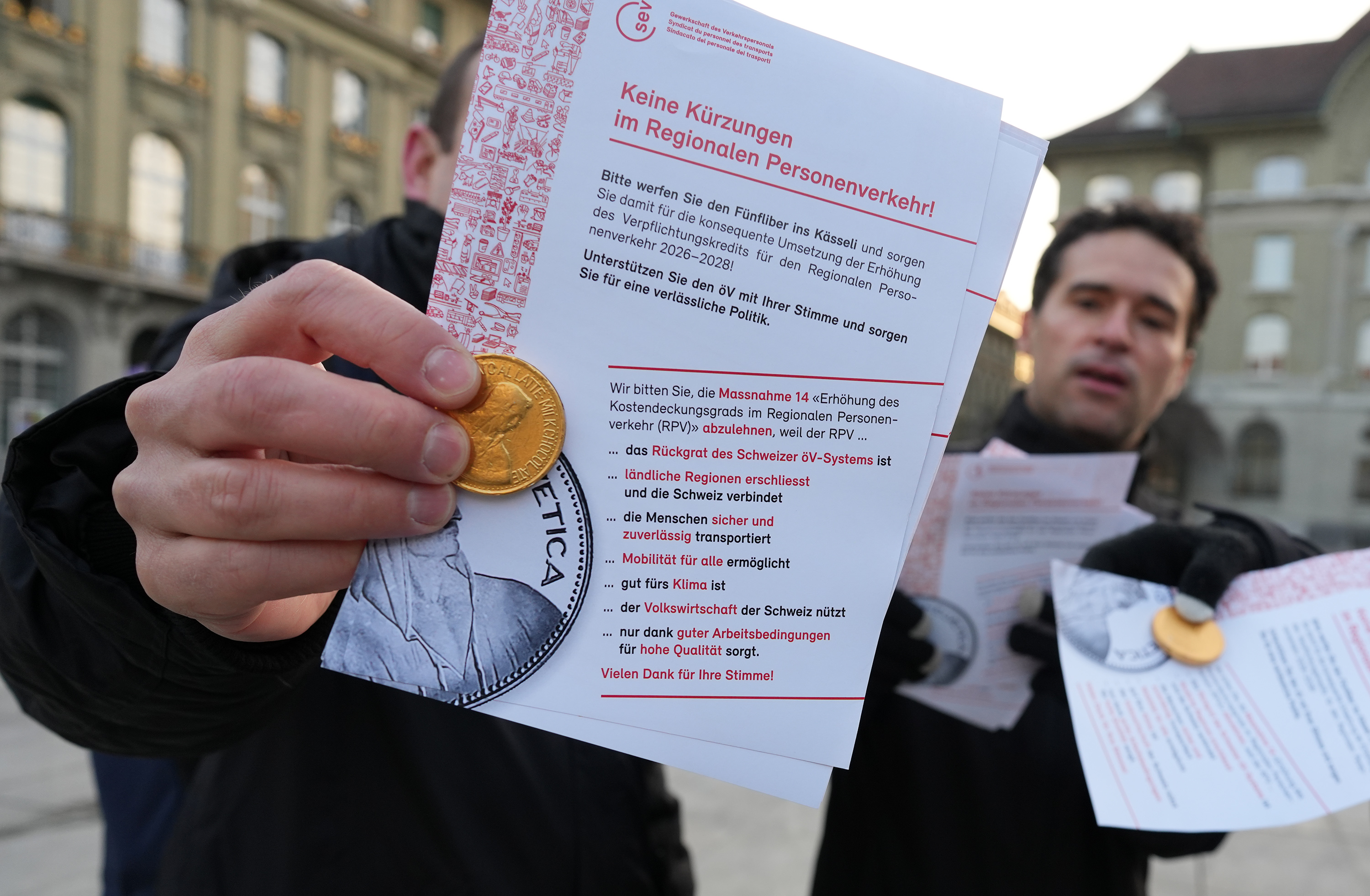 Der SEV hat am 4. März den Mitgliedern von National- und Ständerat Schokolade-Fünfliber überreicht – verbunden mit der Forderung, im regionalen Personenverkehr (RPV) auf Kürzungen zu verzichten. Die im «Entlastungspaket 27» vorgesehenen Massnahmen führen zu Angebotsabbau, höherer Arbeitsbelastung und gefährden Sicherheit sowie Qualität im öffentlichen Verkehr und ziehen Preiserhöhungen nach sich.