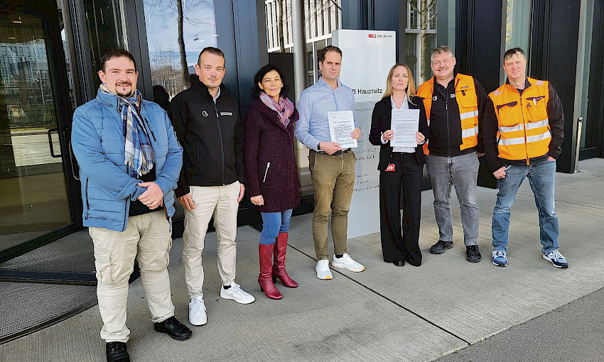 Le 7 novembre, Jan Weber, président central de la sous-fédération SEV BAU et Hubert Koller, vice-président central SEV BAU, ont remis à Berne à Linus Looser, chef CFF Infrastructure, une résolution sur le manque de personnel qualifié dans les professions spécialisées des travaux chez CFF Infrastructure.