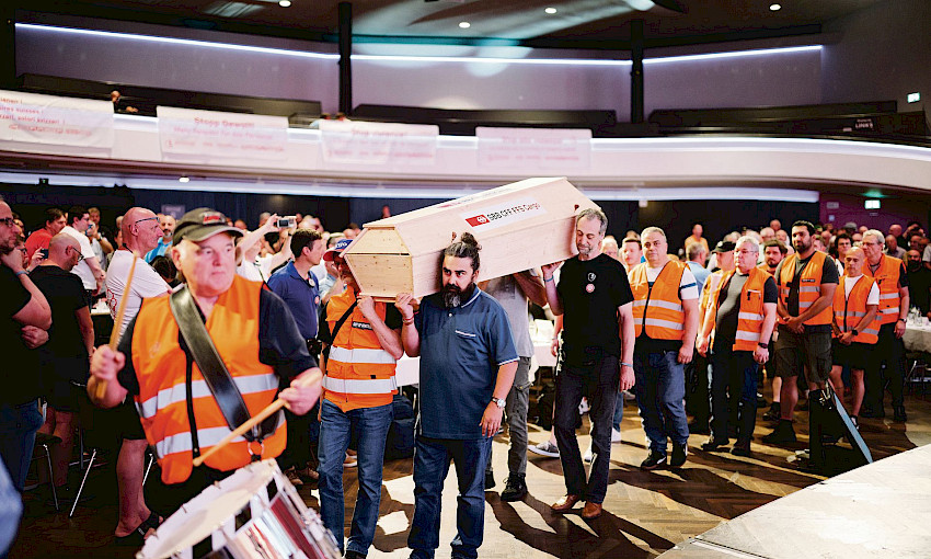 Dans une salle comble, un cortège funèbre a été organisé pour le démantèlement de Cargo, une action à fort impact émotionnel et très symbolique. C’est ce que le SEV craint de voir se produire à la lumière de la stratégie mise en œuvre par l’entreprise. En réponse, le conseiller fédéral a accepté de rencontrer une délégation du SEV pour approfondir la question.