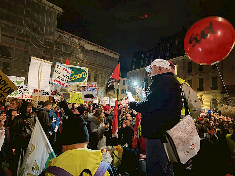Le 26 novembre en fin d’après-midi, une partie du personnel des tl (transports publics lausannois) s’est joint au cortège de la fonction publique vaudoise en lutte. Cela a permis de témoigner leur solidarité avec le service public attaqué en raison des coupes budgétaires prévues (plus de 300 millions) par le Conseil d’État assis sur un matelas de plus de 11 milliards. Le but était aussi d’attirer l’attention sur la dégradation des conditions de travail, de sécurité et de santé aux tl, ainsi que sur le blocage dans le renouvellement de la CCT-tl.