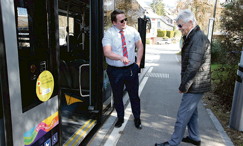Patrick Eilinger explique patiemment à un passager intéressé comment les personnes en fauteuil roulant peuvent monter dans un bus à plancher abaissé. Le retraité est surpris lorsque le chauffeur lui montre la faible distance entre le bus et le trottoir. Il lui explique qu’il s’intéresse beaucoup au côté technique des bus et remercie le chauffeur en montant dans le véhicule.