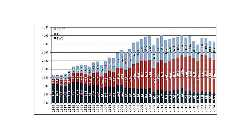 Nel 2024, le prestazioni del trasporto merci su strada e ferrovia si sono attestate complessivamente (quindi non solo nel transito alpino) a 26,1 miliardi di tonnellate/chilometro (t/km), con un calo minimo dello 0,1% rispetto all’anno precedente. Lo ha comunicato in novembre l’ufficio federale di statistica (UST), rilevano però come il traffico su strada è aumentato dell’1,4% rispetto al 2023, raggiungendo i 16,5 miliardi di t/km, mentre il traffico ferroviario è calato del 2,6 %, fermandosi a 9,6 miliardi di t/km. Queste evoluzioni discordanti hanno portato la quota del trasporto stradale al 63 % (+ 1), mentre la quota della ferrovia è scesa al 37 %.